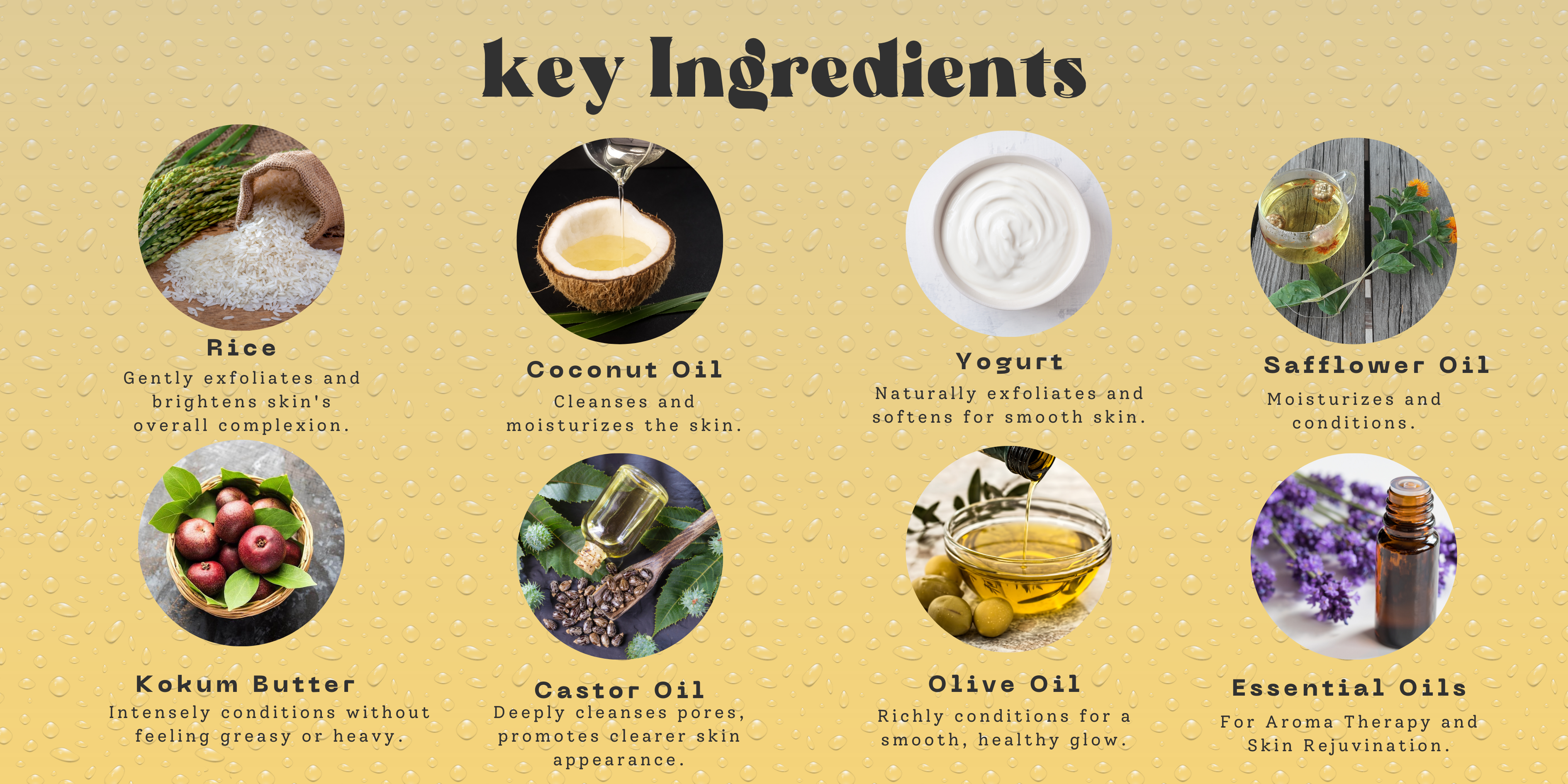 Botanicals & Actives - Yogurt (Dahi), Rice (Oryza Sativa, Chawal); Essential Oil Blend - Bergamot Essential Oil (Citrus Aurantium Bergamia), Geranium Essential Oil (Pelargonium Graveolens, Gulmehendi), Frankincense Essential Oil (Boswellia Serrata, Salai Guggal), Benzoin Essential Oil (Styrax Benzoin, Loban); Butters (Saponified) - Kokum Butter (Garcinia Indica, Kokum); Natural Oils (Saponified) - Coconut Oil (Cocos Nucifera), Palmolein Oil (Elaeis Guineensis), Safflower Oil (Carthamus Tinctorius, Kusum), Olive Oil (Olea Europaea, Jaitun), Castor Oil (Ricinus Communis, Arandi); Glycerin (naturally retained); Base - Aqua (Purified Water), Citric Acid, Sodium Lactate